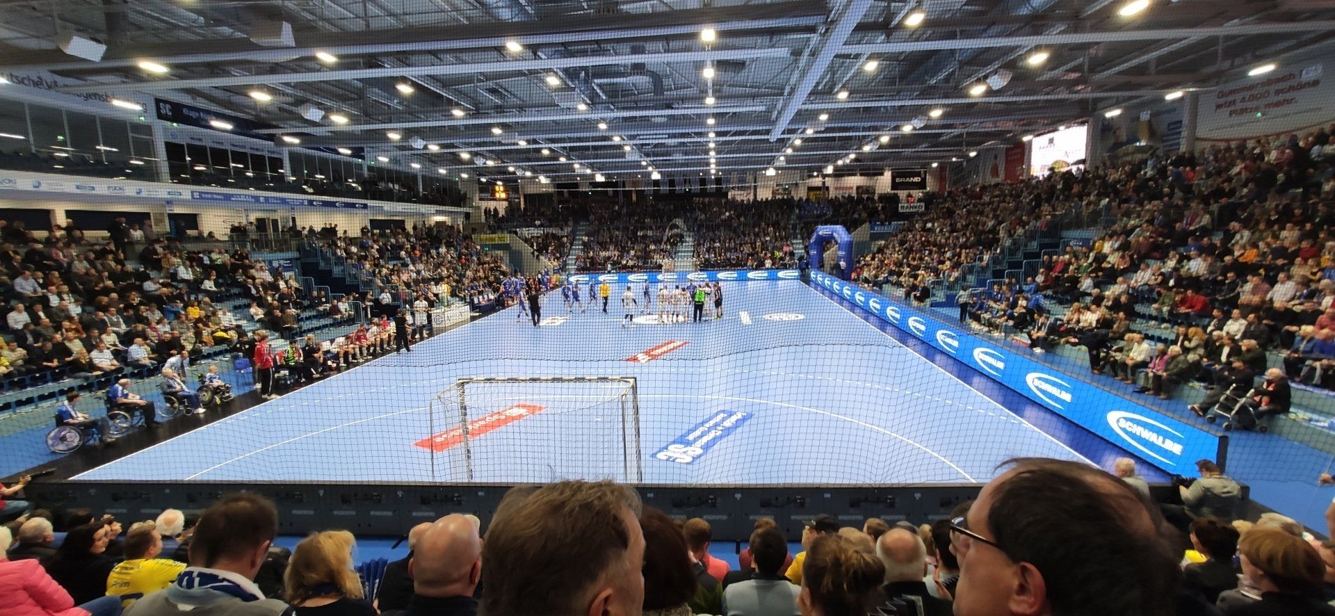 Handball-Bundesliga vor beeindruckender Kulisse mit 18:15, nachdem der in der zweiten Hälfte wie entfesselt auftrumpfende Patrick Weber soeben zum 7. Male getroffen hatte und den zwischenzeitlichen 5:9-Rückstand noch aus der 1. Halbzeit fast im Alleingang umgedreht hatte.