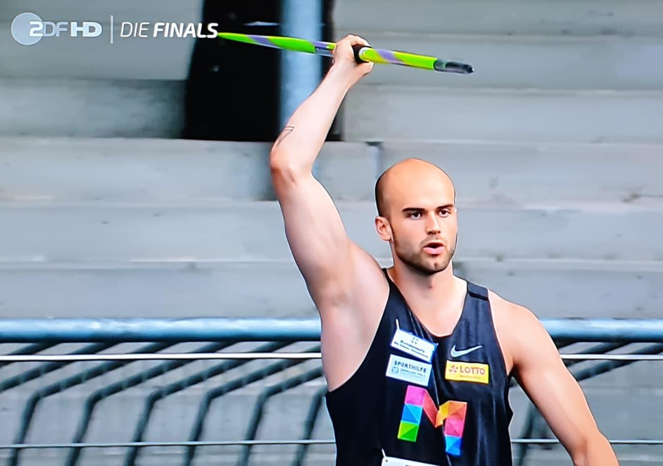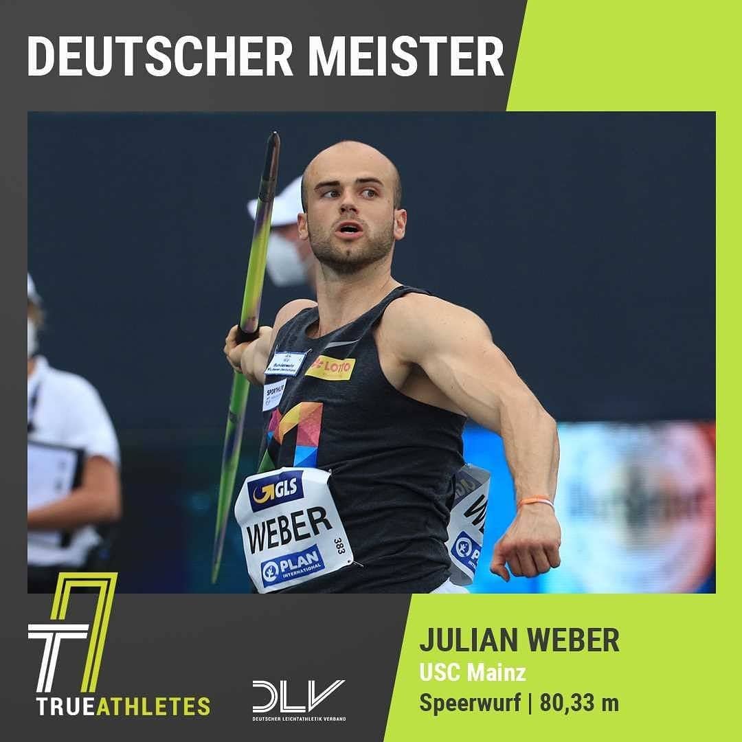 Es ist krass! Das ist mein erster Titel – und das mit der Weite, hätte ich auch niemals gedacht. Ich bin einfach mega happy, auch endlich mal einen Titel zu gewinnen. Natürlich nicht unter den besten Umständen, aber Titel ist Titel! Es werden noch andere Weiten kommen. Es war heute leider nicht ganz der Fall, aber ich bin sehr positiv gestimmt, dass das noch weiter gehen kann. Es ist gar nicht so einfach gewesen mit dem Regen vorher. Das hatte ich tatsächlich fast noch nie, Regen beim Wettkampf oder Regen vor dem Wettkampf. Wie man in den Wettkampf reinkommt, ist einfach komplett anders. Das war echt schwierig. Dann stimmt es nicht zu 100 Prozent und dann geht es nicht so weit, wie man gerne hätte. Man kann nicht genau sagen, ob ich der Favorit war. Bernie [Bernhard Seifert] ist auch stark, Thomas [Röhler] ist stark, man wusste auch nicht vorher, wer wie weit wirft. Ich wusste, dass ich etwas draufhabe und um den ersten Platz werfen kann, aber dass das jetzt so gut geklappt hat, mit einer leider nicht so guten Weite, hätte ich nicht gedacht. Wir [Bernhard Seifert und Julian Weber] ergänzen uns im Training richtig gut. Wir motivieren uns gegenseitig, es macht richtig Spaß im Training. Wir sind echt eine coole Truppe, haben noch ein paar andere motivierte jüngere Speerwerfer in der Gruppe, und auch [Speerwerferin] Annika Fuchs, die jetzt leider nicht dabei sein konnte bei der Deutschen Meisterschaft. Mega gutes Umfeld, cooler Trainer, das gibt mir auf jeden Fall viel. Durch die Olympiaverschiebung konnte ich einiges aufarbeiten. Letztes Jahr wäre ich nicht so optimistisch gewesen, zu Olympia zu fahren. Jetzt sieht das schon ein bisschen anders aus. Ich konnte sehr viel an meiner Athletik, Schnelligkeit und Technik arbeiten. Das funktioniert im Training auch schon richtig gut, im Wettkampf habe ich es noch nicht ganz so umgesetzt bekommen. Aber ich bin, denke ich, auf jeden Fall auf dem richtigen Weg. Das war jetzt mein dritter Wettkampf dieses Jahr, ein bisschen Routine fehlt mir auf jeden Fall noch. Der Rhythmus stimmt noch nicht immer, der Anlauf ist noch nicht immer zu 100 Prozent der gleiche. Da muss ich noch ein bisschen Erfahrung sammeln, ein paar Wettkämpfe machen, damit ich da das Selbstbewusstsein habe, voll reinzugehen und alles draufzulegen. Ich bin leider noch nicht richtig unter den Speer gekommen, habe heute leider nicht ganz den Zug draufbekommen, bin ein bisschen vorne reingefallen. Ein paar technische Defizite, aber das wird auf jeden Fall wieder.